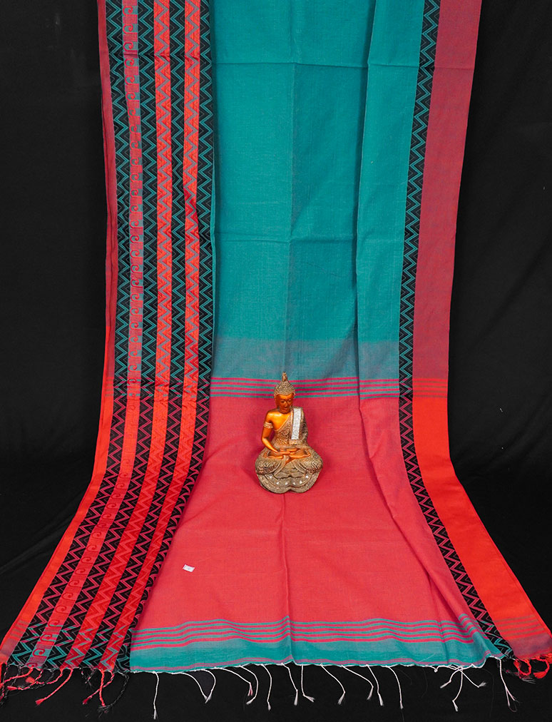 Teal Green & Red Zig Zag Border Begumpuri Cotton Saree