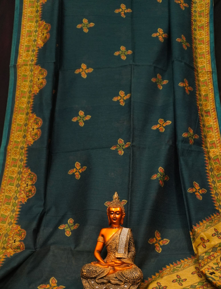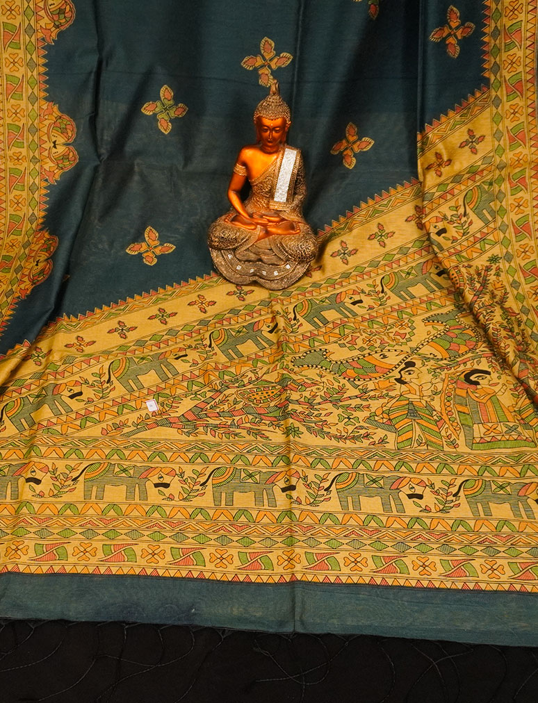 Madhubani Printed Handloom Bottle Green Cotton Saree