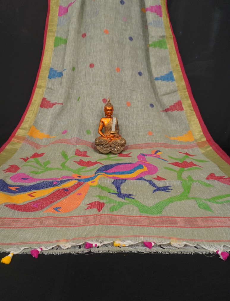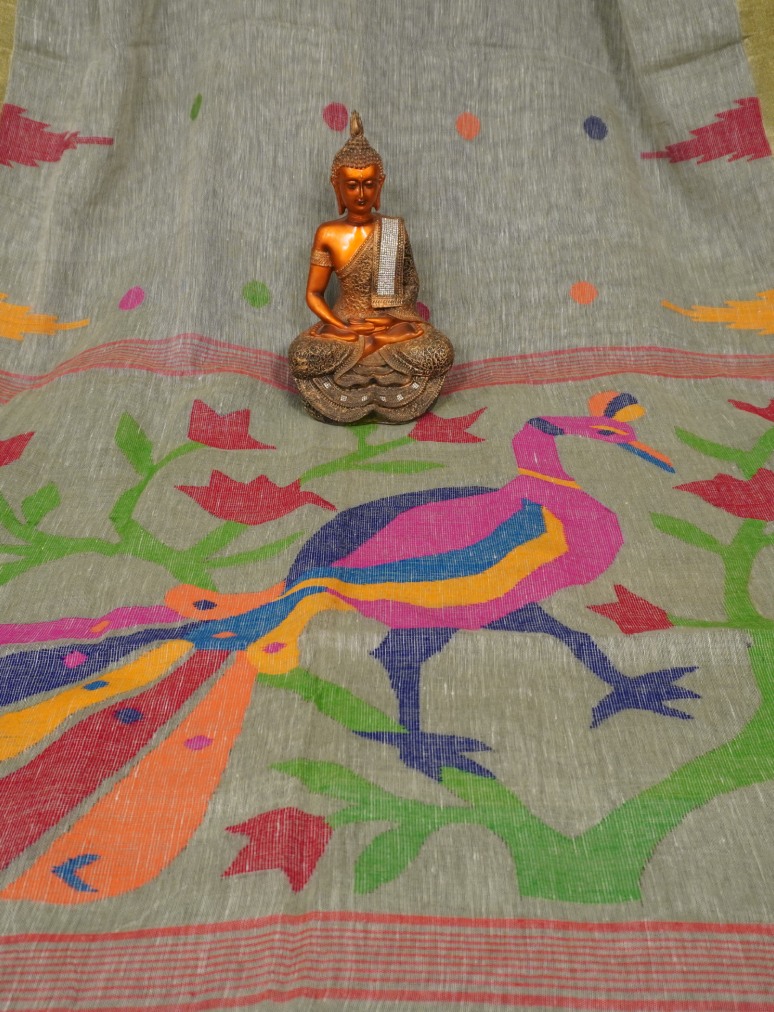 The Off White color saree is crafted with golden zari made buti and Temple all over the body. The Off White color pallu have Peacock designed work with buti tree. Golden zari made designer border all along.