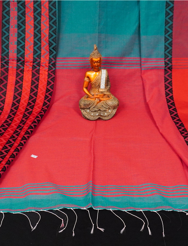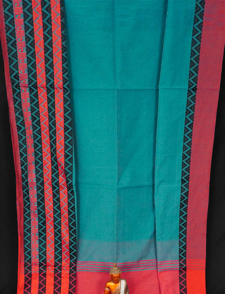 Teal Green & Red Zig Zag Border Begumpuri Cotton Saree